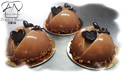 Mousse al caffè, con una base di biscuit alla vaniglia, cereali e FANTA NOCCIOCROCK (Elenka) ,mousse al cioccolato a latte e bianco, mousse al caffè ,glassa al cioccolato a latte e bianco con cornice di filetti di mandorla aromatizzati al caffè.